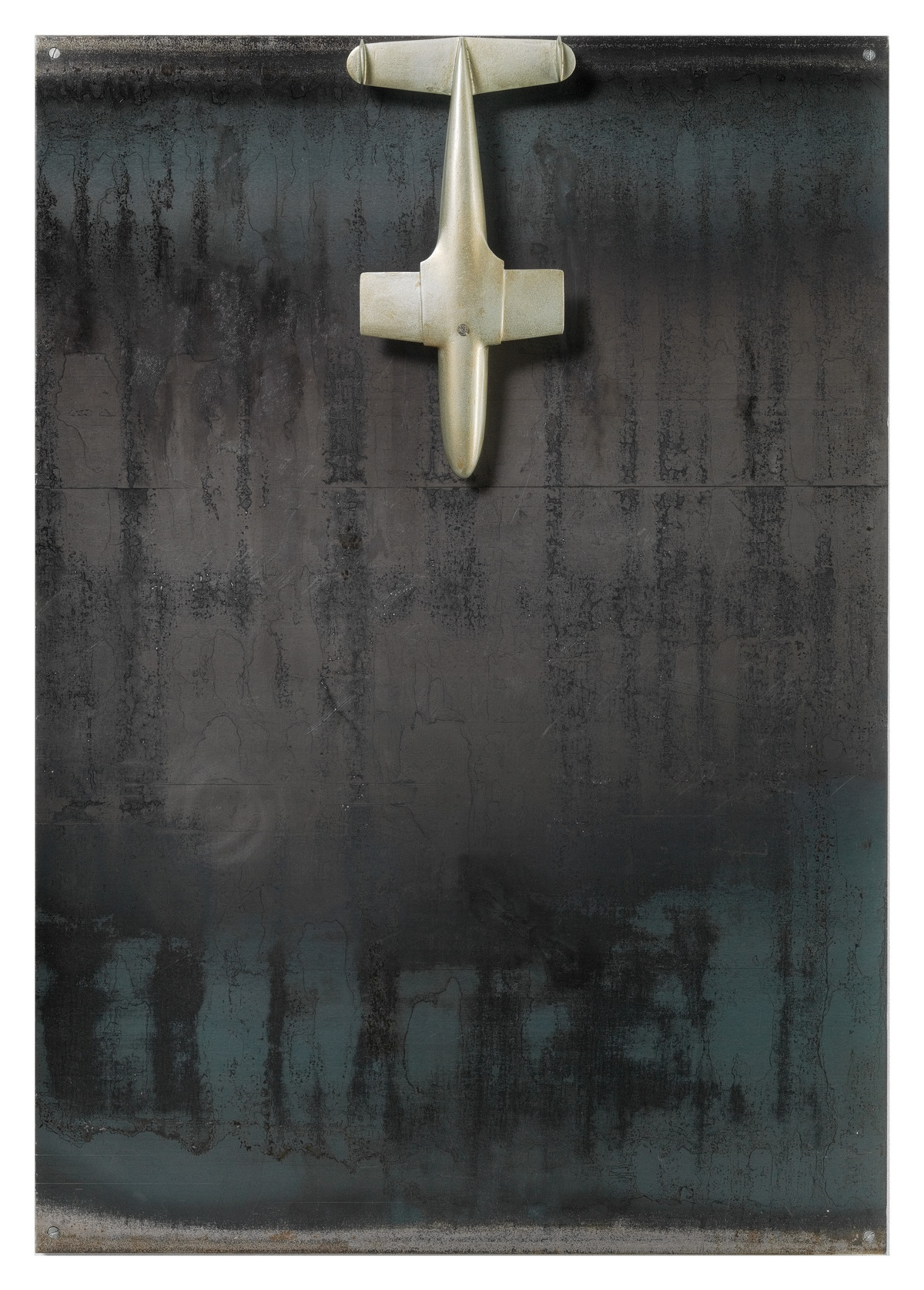 A model aeroplane hung upside down, shorn of its wings, on the upper edge of a black iron plate. This work was part of the ‘Picnic o Il buon soldato’ installation (inv. 3204).