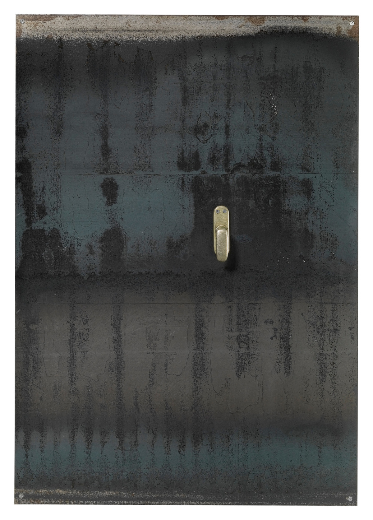 A sheet of black iron backs a window-frame handle. Similar to Maniglia (inv. 542) if in a larger format, the work was part of the ‘Picnic o Il buon soldato’ exhibition-installation (inv. 3204).