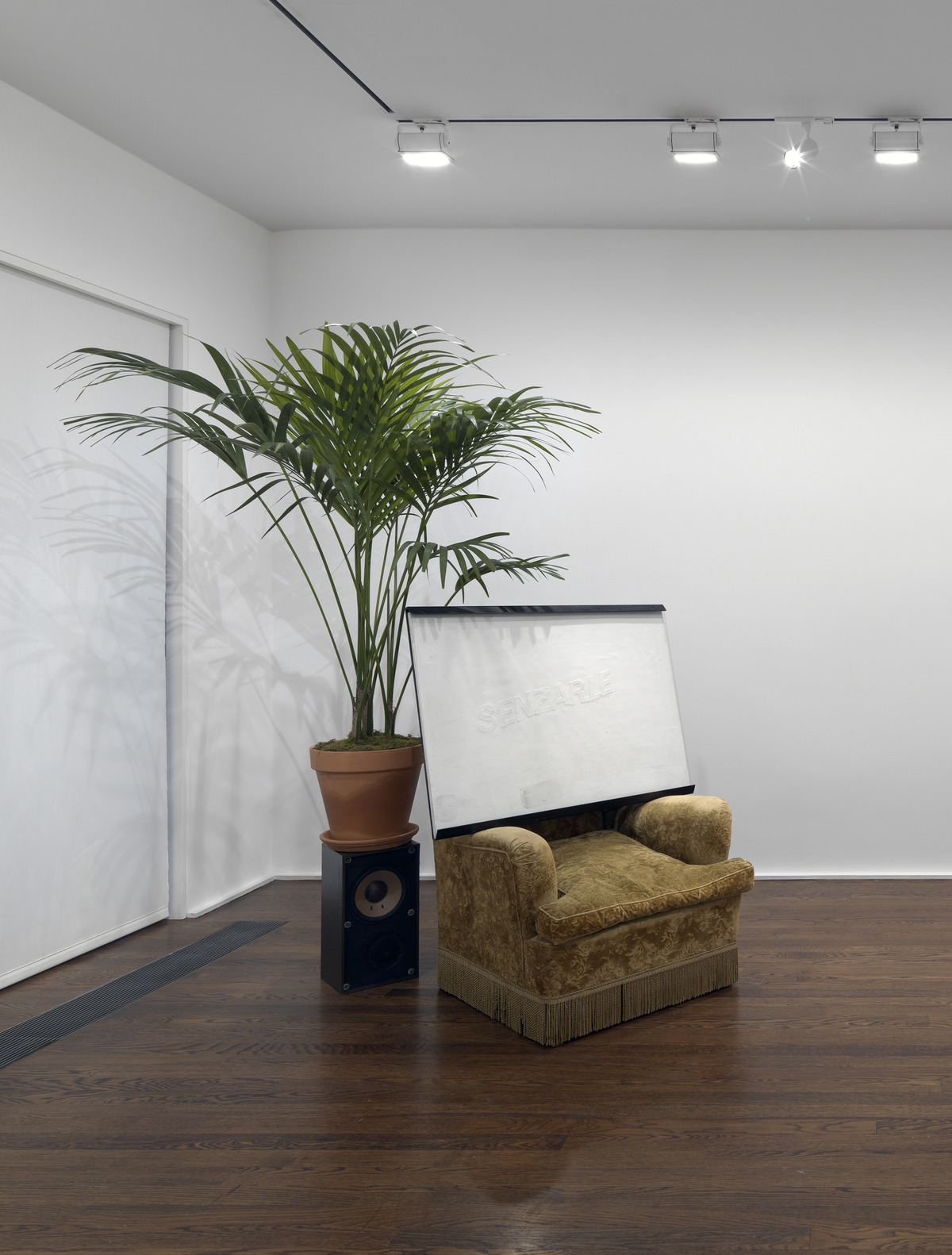 MATERIALS: Armchair, plant, loudspeaker turned off, gesso and paper on wood, iron frame, glass