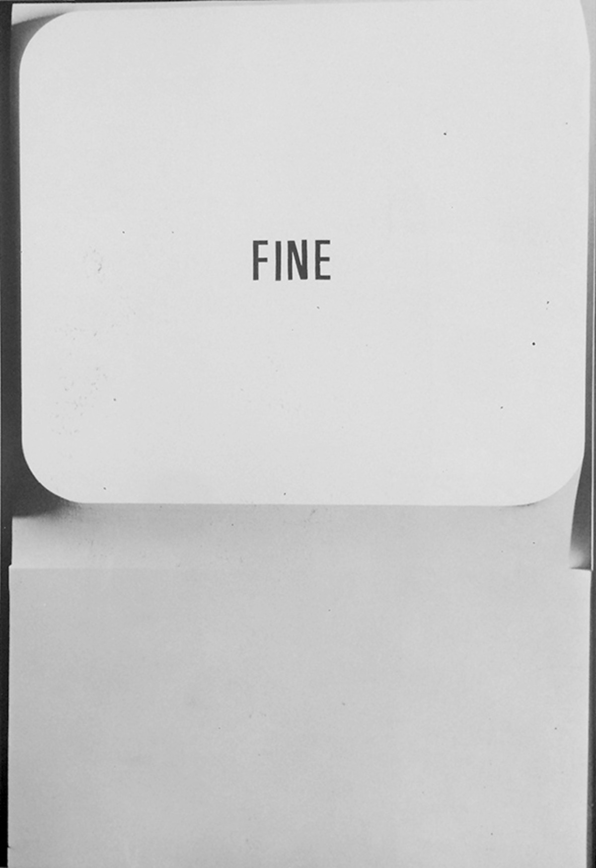 Schermo di “seconda generazione” composto da una tela bianca dipinta e tesa su un telaio in legno aggettante, incorniciato da una cornice nera senza vetro. Al centro della parte aggettante, campeggia la scritta “Fine”, leitmotiv dell’opera di Mauri e indicatore di una proiezione già avvenuta. L’opera era uno dei quattro schermi che introducevano all’installazione La Luna (cfr. inv. 922) nella mostra “Vitalità del Negativo” nel 1970 riportando la parola "Fine" in italiano, inglese, tedesco e francese, come documentato dalle fotografie di Ugo Mulas.