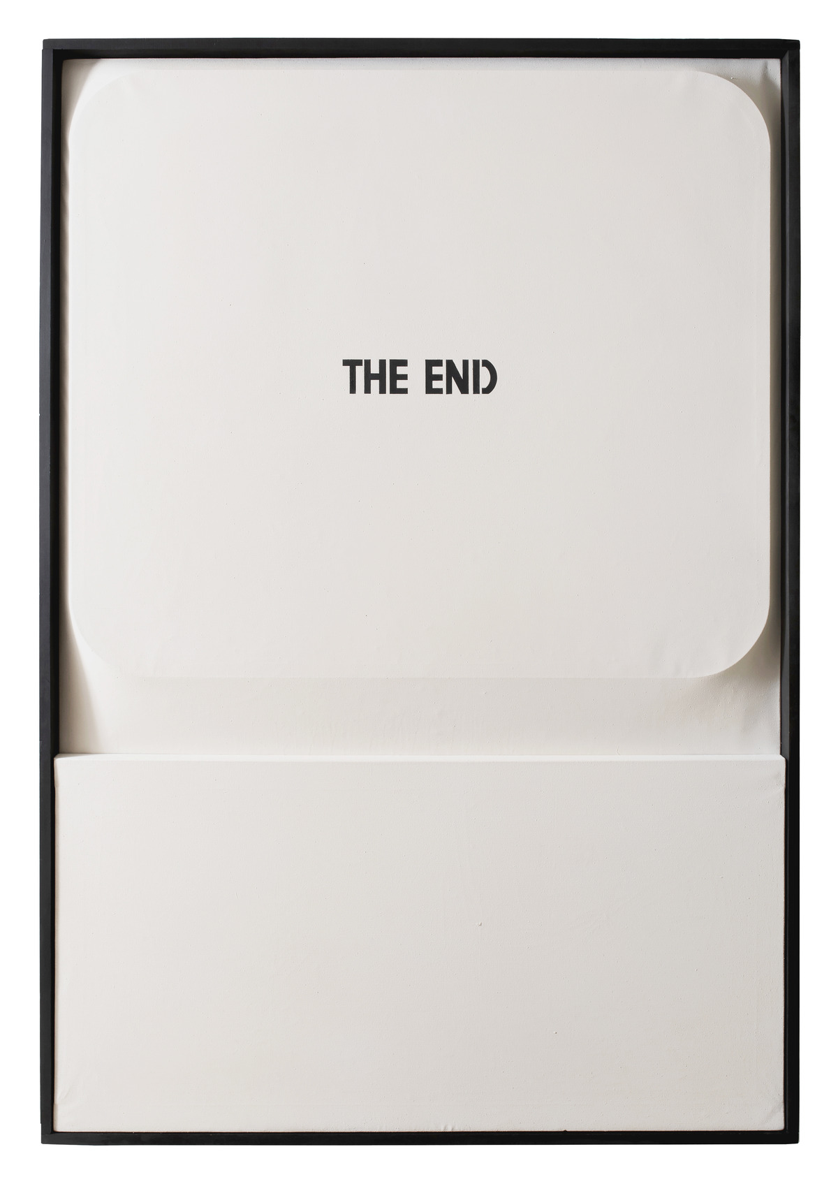 Schermo di “seconda generazione” composto da una tela bianca dipinta tesa su un telaio in legno aggettante circondato da una cornice nera senza vetro. Al centro della metà superiore campeggia la scritta «THE END», leitmotiv dell’opera di Mauri e indicatore di una proiezione già avvenuta. L’opera era uno dei quattro schermi che introducevano all’installazione Luna (inv. 922) nella mostra Vitalità del Negativo del 1970, declinando la parola “fine” in italiano, inglese, tedesco e francese, come documentato dalle fotografie di Ugo Mulas.