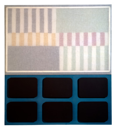 Schermo caratterizzato da una struttura bipartita che presenta nella parte superiore un dipinto su tela geometrico velato da una garza semitrasparente e leggermente aggettante, e nella parte inferiore un monocromo azzurro sul quale si dispongono sei tavolette di legno dagli angoli arrotondati dipinte di nero.