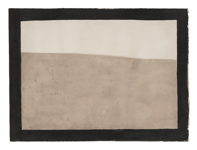Schermo-disegno caratterizzato da una cornice nera dipinta lungo i bordi del foglio che inquadra un dipinto astratto, suddiviso trasversalmente in due parti di colore diverso.