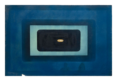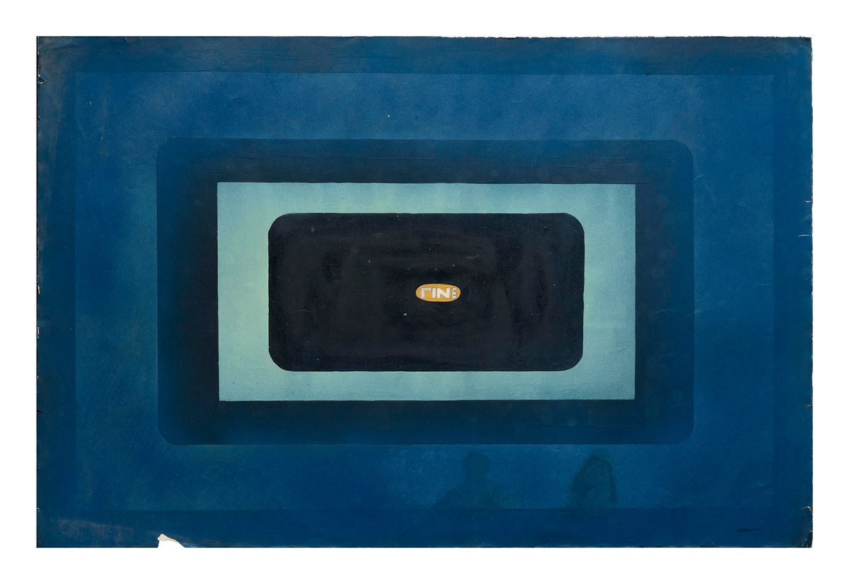 Schermo-disegno caratterizzato da una cornice nera dipinta lungo i bordi del foglio che definisce un “campo di proiezione” entro il quale campeggia un rettangolo-schermo recante al centro la parola «FINE». L’opera si distingue per una materia pittorica sperimentale che si compone di smalti, matita grafite, pennarello, olio sintetico per serigrafie e, distinguibili solo al verso, immagini trasferite con la tecnica della decalcomania e poi coperte dal fondo dipinto.