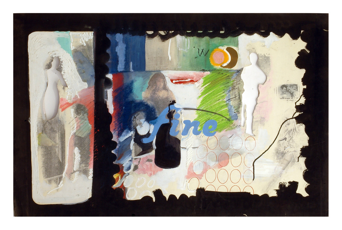 Schermo-disegno caratterizzato da una fascia nera dipinta lungo i bordi del foglio che definisce un “campo di proiezione” suddiviso in due parti. Nel riquadro di destra, la cornice segue un andamento “a nuvola” che ricorda quello di Schermo con pubblico (inv. 176), esteso però a tutti e quattro i lati. L’opera si caratterizza per la tecnica composita che combina tempera, grafite, trasferimento con trielina di immagini stampate, china, carboncino, pastello a olio, smalto a olio sintetico, pennarello e, in corrispondenza della silhouette in alto a destra, intaglio.