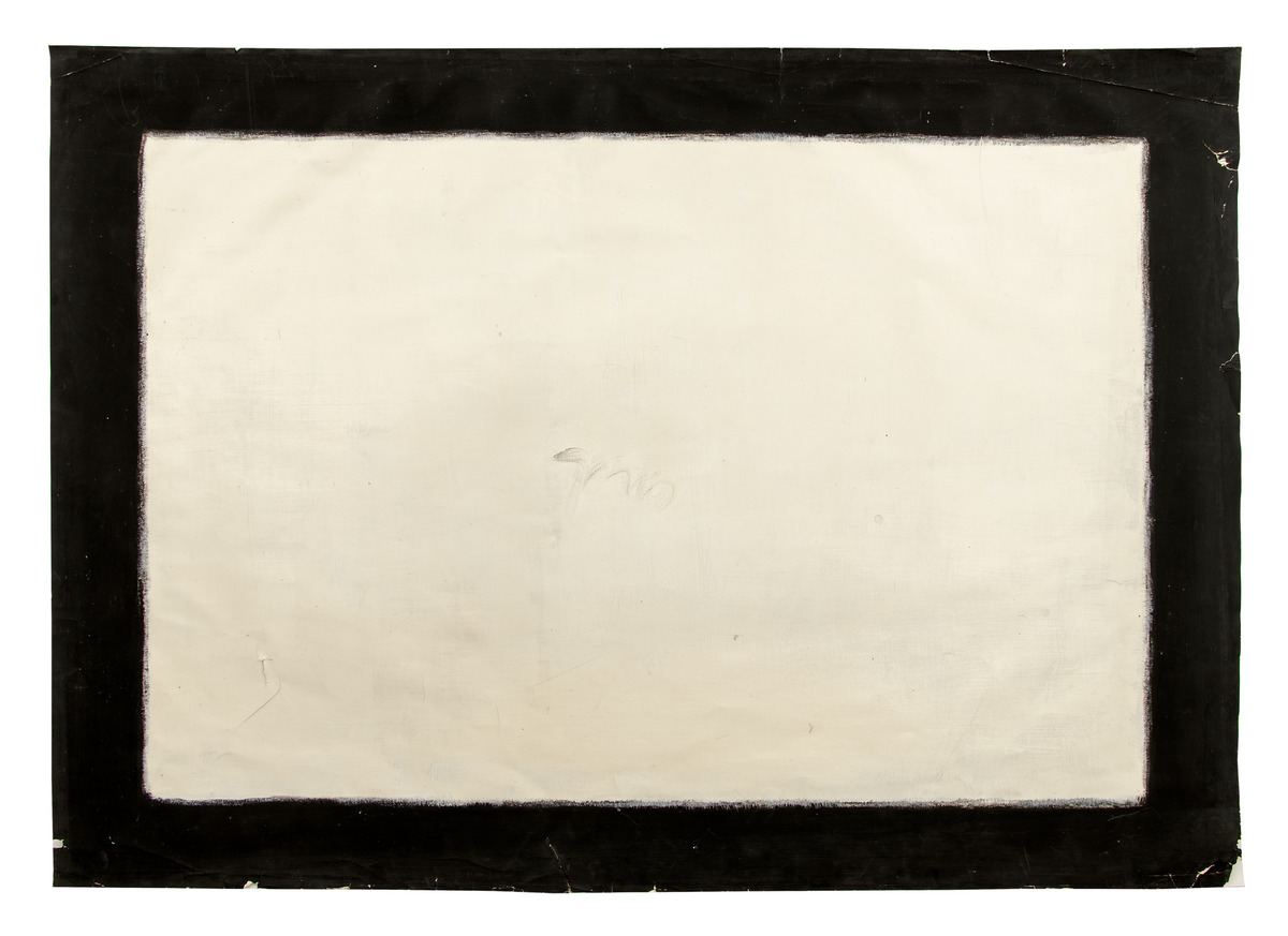 Schermo-disegno caratterizzato da una cornice nera dipinta lungo i bordi del foglio che definisce un “campo di proiezione” simile a quello dei primi schermi del 1957 (cfr. inv. 186), dai quali tuttavia si distingue per la natura pittorica del monocromo bianco.