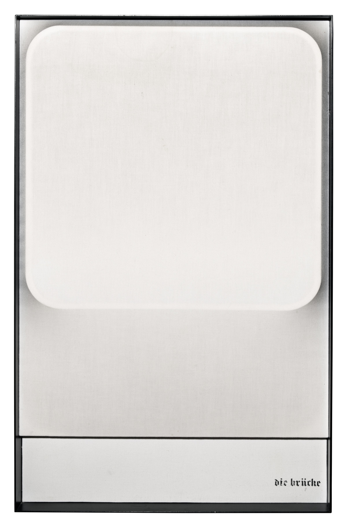 Schermo aggettante in tela “millerighe” inserito in una cornice a cassetta con fondo in cartone rivestito della stessa stoffa. Sul cartone, impaginato in basso verso destra, il titolo dell’opera è riportato con lettere trasferibili Letraset in carattere gotico tedesco.
