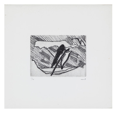 Acquaforte su carta stampata presso lo Studio Piranesi a L’Aquila. Il soggetto riprende la tematica dell’Apocalisse che domina nelle opere su carta della prima metà degli anni ottanta: una serie di paesaggi dai cieli plumbei con nuvoloni, raggi e trombe apocalittiche all’orizzonte annunciano l’imminente catastrofe che sta per abbattersi su lande ormai desolate in cui rimangono, forse superstiti, solo degli esili fiori neri.