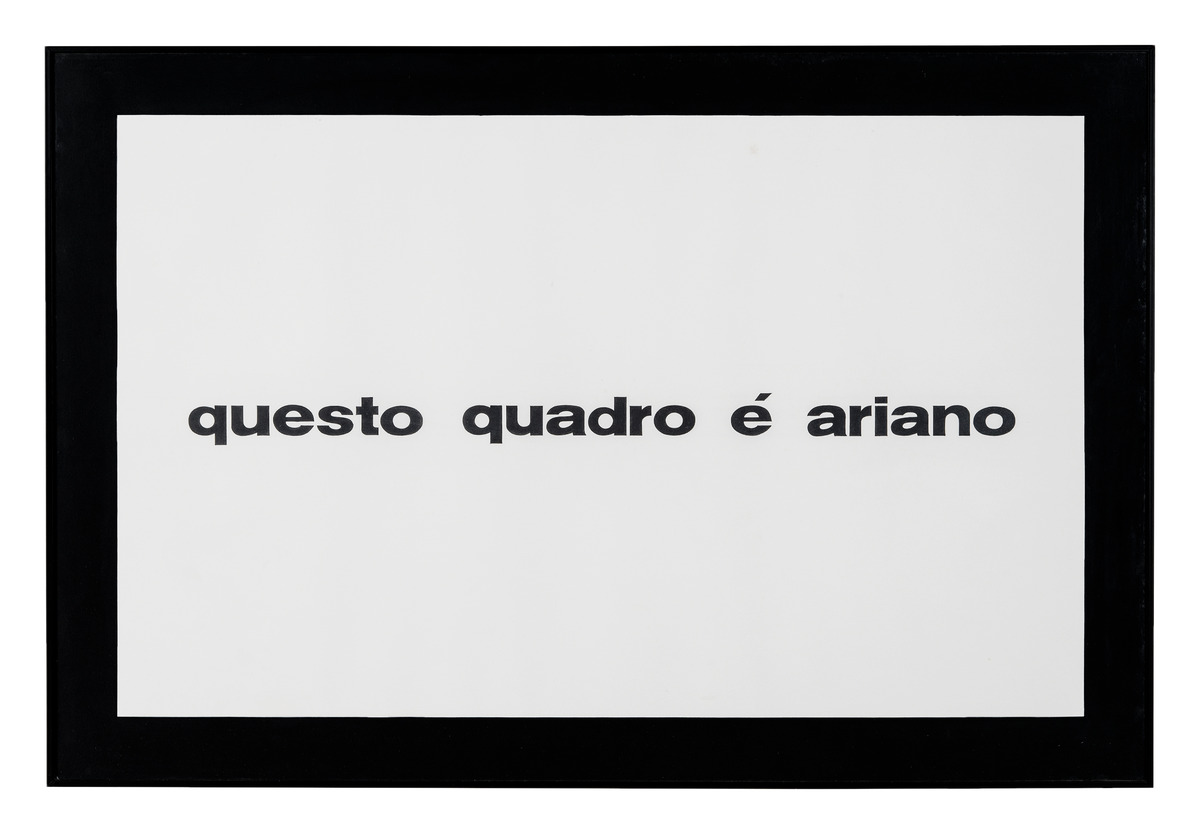 Una cornice nera dipinta lungo i bordi di un foglio bianco inquadra la frase «Questo quadro è ariano», dipinta al centro del disegno-schermo. L’opera precede di alcuni anni gli “oggetti ariani” della mostra-installazione Arierwiege (cfr. inv. 1023), ove l’attributo “ariano” è usato come indice ideologico dell’assurdo «concetto di appartenenza a qualcosa che precedendoti ti conferisce valore o disvalore, come il concetto di razza»1.