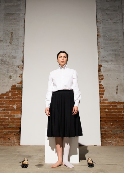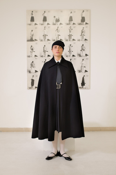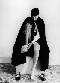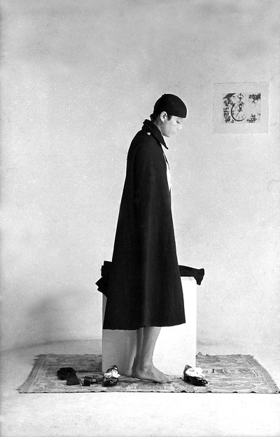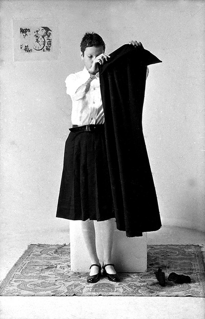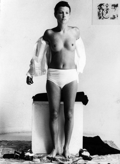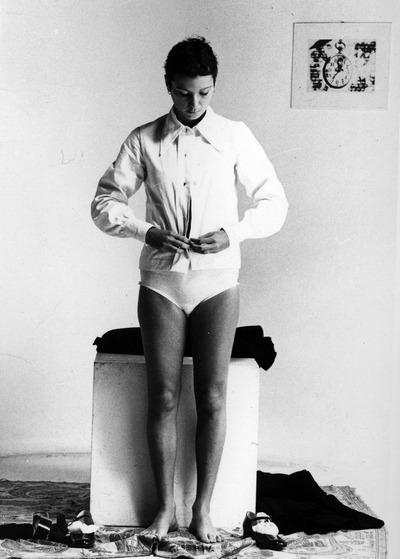 Entra in scena una ragazza in divisa fascista da “Giovane Italiana” e si posiziona davanti a un cubo di legno bianco. Rimanendo sul posto, si gira in senso antiorario di novanta gradi, poi di altri novanta e ancora, fino a ritornare in posizione frontale. Quindi si siede, porta i piedi sul piano, a gambe aperte guarda il pubblico, lasciando che l’ampia gonna ricada ai lati scoprendo le mutande di cotone bianche. La giovane si rialza e con movimenti lenti e composti si toglie il copricapo, lo piega, tenendolo in mano davanti a sé. Come prima, fa un quarto di giro sul posto, poi un altro: dando le spalle al pubblico, appoggia il cappello, piegato, sul cubo; quindi lentamente, in due tempi, ritorna in posizione frontale. Poi si toglie la mantella e la sequenza si ripete identica, e così per ogni indumento, fino a che la performer rimane nuda. Seguendo la stessa dinamica, la ragazza indossa nuovamente un capo alla volta per poi ancora svestirsi e rivestirsi. A questo punto, la perfetta disciplina dell’azione è turbata da una sequenza di abiti inconsueta, che dà adito a combinazioni bizzarre che tolgono serietà alla divisa, suggerendo una stortura di fondo, una spontanea resistenza alla vestizione ideologica in netto contrasto con la naturalità del nudo.