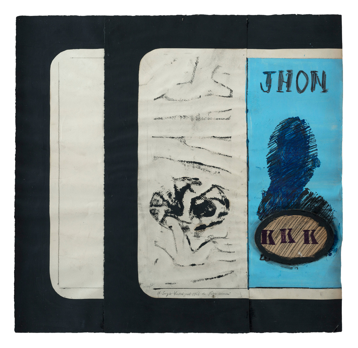 Collage composto da due schermi-disegni tagliati a metà e sovrapposti tra loro, leggermente sfalsati. Sulla destra, sotto la scritta «Jhon», è disegnata, a inchiostro su sfondo azzurro, la silhouette di un volto sul quale è applicato un ovale con la sigla «KKK». Il disegno vuole probabilmente citare l’organizzazione statunitense antirazzista John Brown Anti-Klan Committee, schierata contro il Ku Klux Klan (KKK) e altre frange suprematiste bianche. Accanto a «Jhon», sotto un disegno astratto a carboncino, compare la dedica di Mauri all’artista italiano Sergio Vacchi (1925-2016).