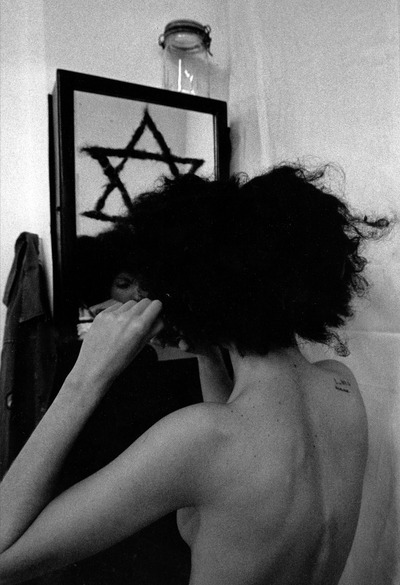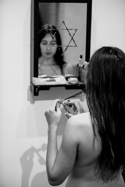 In un angolo in fondo, unico corpo vivo in questo cimitero di design, una giovane sta in piedi davanti a un armadietto da bagno, nuda. Lentamente, con un paio di forbici, si taglia delle ciocche di capelli e le incolla, poche per volta, sul vetro dello specchio disegnando una stella di David, simbolo di un’identità non scelta, motivo unico della sua condanna.
