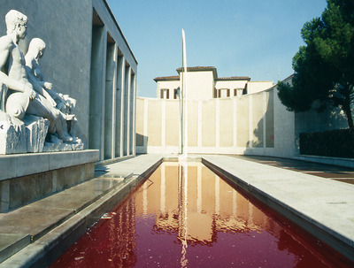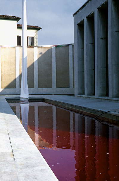 Installazione site-specific realizzata per la manifestazione Umanesimo / Disumanesimo nell’arte europea 1890-1980 tenutasi a Firenze nel 1980, la quale prevedeva dieci installazioni di altrettanti artisti contemporanei disposte lungo un percorso storico in luoghi indicativi di una «condizione ambigua della definizione di un momento particolare di crisi quale fu rappresentato, pur nel suo splendore, dall’Umanesimo, che ha in sé i termini del proprio rovescio: Disumanesimo»1. Per il suo intervento, Fabio Mauri scelse la vasca della Palazzina Reale della stazione centrale di Santa Maria Novella. Architettura fascista inaugurata nel 1935, la Palazzina Reale era stata teatro di diverse manifestazioni, tra cui la visita di Hitler nel 1938 in un tripudio di stemmi, simboli, bandiere e parate. Quarantadue anni dopo, Mauri tinse l’acqua della fontana di rosso e, in luogo del Tricolore, installò sull’asta della bandiera una tela bianca da pittore che «scendeva fino a immergersi completamente nell’acqua tinta color del sangue, e si depositava sul fondo imbevendosi progressivamente di rosso»2.