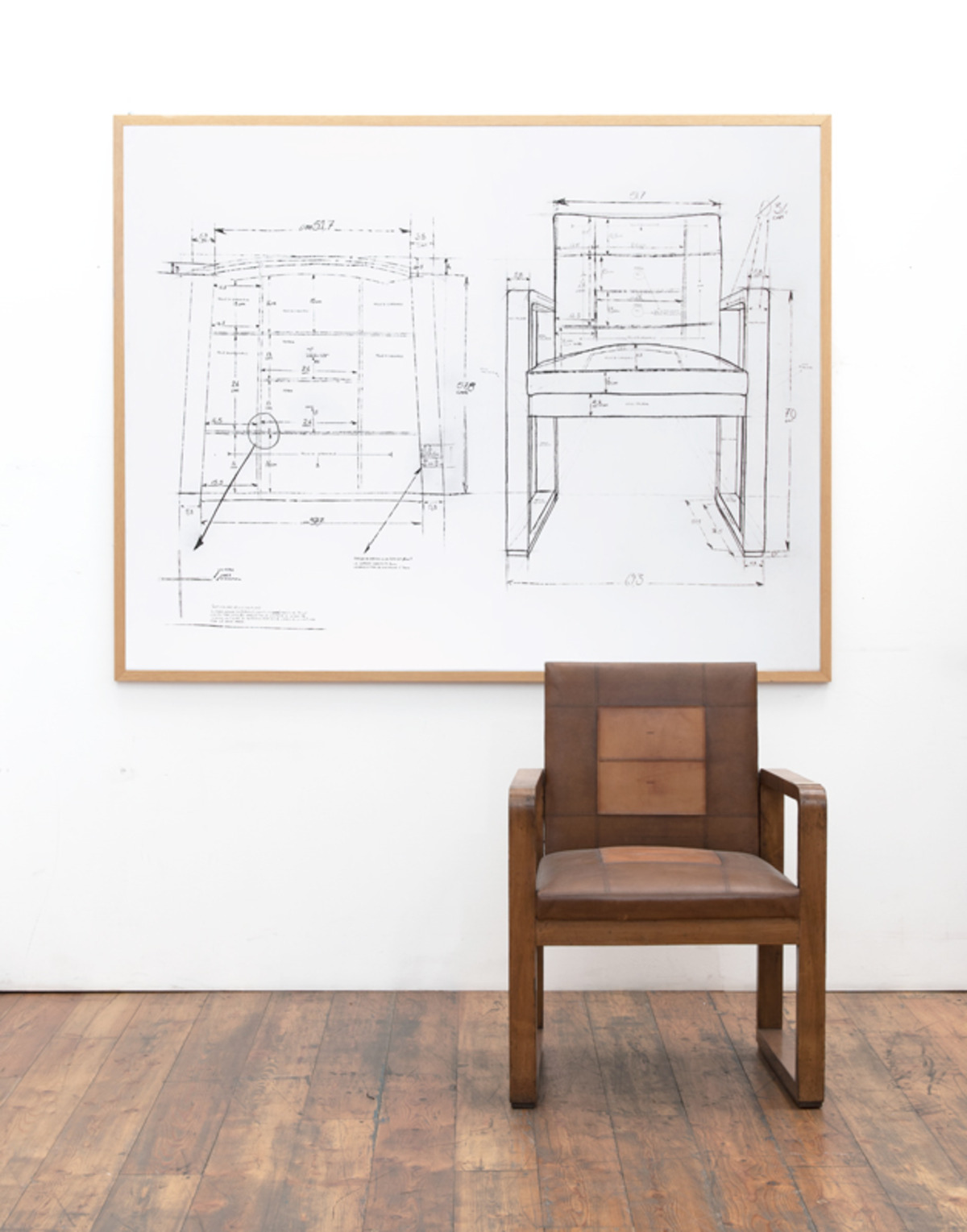 Installazione composta dall’opera del 1971 Sedia in pelle ebrea – Norimberga 1941 (inv. 323) e dal disegno tecnico a grandezza naturale della stessa, di cui si riportano la proiezione ortogonale e quella prospettica. Il disegno fu realizzato da Mauri nel 2001 e definito dall’artista «post-progetto», a sottolineare il rovesciamento dell’usuale successione esecutiva.