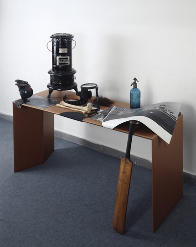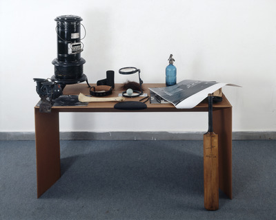 Invitato a realizzare un’installazione utilizzando uno dei mobili di cartone prodotti dall’associazione romana Liberamente, Fabio Mauri sceglie un tavolino basso su quale dispone una composizione di opere, materiali e oggetti provenienti dal proprio studio: una stufa, delle fotografie, un altoparlante, due manopole, una cintura, un collage (inv. 1061), un osso, dei capelli, una lente d’ingrandimento, un disegno su cartoncino, una palla-mondo, un disco, alcuni carboncini, una bottiglia, un collage, un sapone, un piccolo schermo, degli occhiali, una pala da gioco. L’opera sarà smantellata al termine della mostra e molti degli oggetti saranno riutilizzati in opere successive.