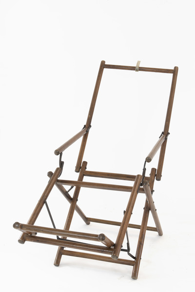 Scheletro senza tessuto di una sedia reclinabile in legno, Chaise Longue è un «oggetto designato per una ricreazione assoluta, ma impraticabile per l’assenza del telo che doveva garantirne macchinosamente la seduta»1. Privata della sua funzione utilitaria, la sedia si dà come oggetto incompiuto prestato alla contemplazione. Una cartina da dentista, arrotolata sullo schienale come fosse un’etichetta museale, riporta la sigla dell’artista e la data dell’opera.