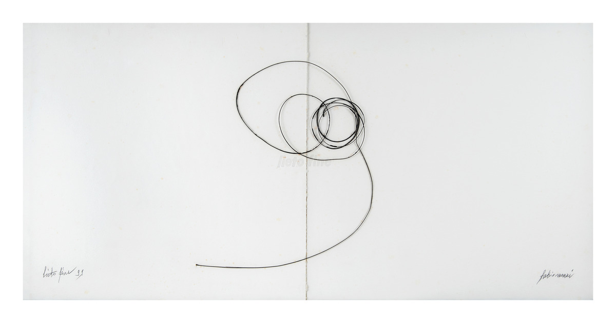 Due fogli di carta cotone quadrati sono giustapposi uno accanto all’altro e incorniciati a formare una composizione unica di formato orizzontale. Le parole «lieto» e «fine» sono incise a secco rispettivamente sul bordo destro del foglio sinistro e sul bordo sinistro del foglio destro, così da risultare al centro del quadro. Un fil di ferro sfilato da uno pneumatico si avvolge a spirale al centro, a cavallo tra i due fogli. Il collage, che fu fatto incorniciare così dall’artista, fa parte di un insieme di opere che afferiscono al concetto di Art nègre (cfr. inv. 485).