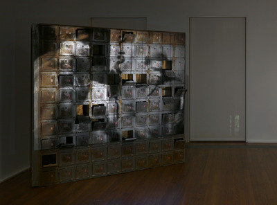 Un mobile di metallo proveniente dal carcere romano di Rebibbia è appoggiato a terra ribaltato su un fianco. Le porte dei cento armadietti si aprono naturalmente – alcune più, alcune meno – frastagliando la proiezione del film Ballata di un soldato di Grigory Chukhray.