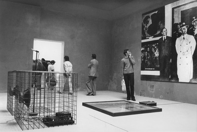 DIMENSIONI: Fotografia: 300 × 500 cm; Lavagna: 300 × 500 cm [10 pezzi: 100 × 150 cm ciascuno]; 2 gabbie: 100 × 100 × 100 cm ciascuna; 1 gabbia: 60 × 60 × 30 cm; Valigia: 28 × 27 × 8 cm; Litografia: 53 × 42 cm