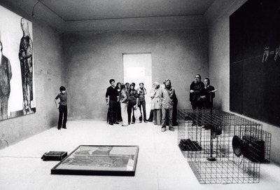 L’installazione fu realizzata a Venezia per la XXXVIII Esposizione Internazionale d’Arte. Dalla natura all’arte, dall’arte alla natura nella sezione curata da Lara-Vinca Masini. All’epoca al posto della litografia di de Chirico vi era un frammento dello Sposalizio mistico di santa Caterina d’Alessandria, attribuito a Giotto, avuto in prestito da un antiquario fiorentino e proveniente dalla Cappella Bonacolsiana della Torre della Gabbia di Mantova. Durante la manifestazione, le gabbie diventavano una sorta di “cattedra” da cui intervenivano artisti e critici: «Da questa struttura, attraverso un microfono, parla, per campioni, il pensiero contemporaneo»1. Tra gli altri, intervennero Alberto Boatto, Emilio Vedova, Furio Colombo.
