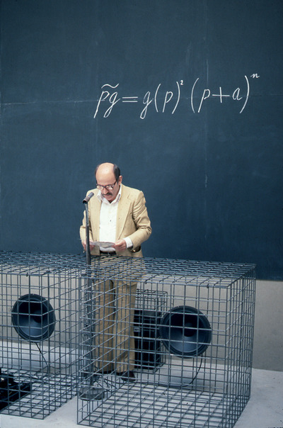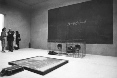 Appese su due pareti parallele, si fronteggiano la gigantografia del ministro Joseph Goebbels (1897-1945) in visita alla mostra Entartete Kunst a Berlino nel 1938 e una lavagna delle stesse dimensioni recante un’enigmatica formula: “pg = g(p)2 (p+a)”. Appoggiate a terra, sotto la lavagna, tre gabbie contengono un impianto stereo che trasmette a intervalli irregolari una frequenza molto bassa, simile a un terremoto. Specularmente, sotto la fotografia di Goebbels, una valigetta nera sembra contenere un congegno a orologeria di cui si sente l’inquietante ticchettio interrotto a tratti dalla domanda: «Cosa è la natura?» formulata in diverse lingue. Accanto alla valigia, distesa al suolo, una litografia di Giorgio de Chirico rappresenta uno dei quattro cavalieri dell’Apocalisse.