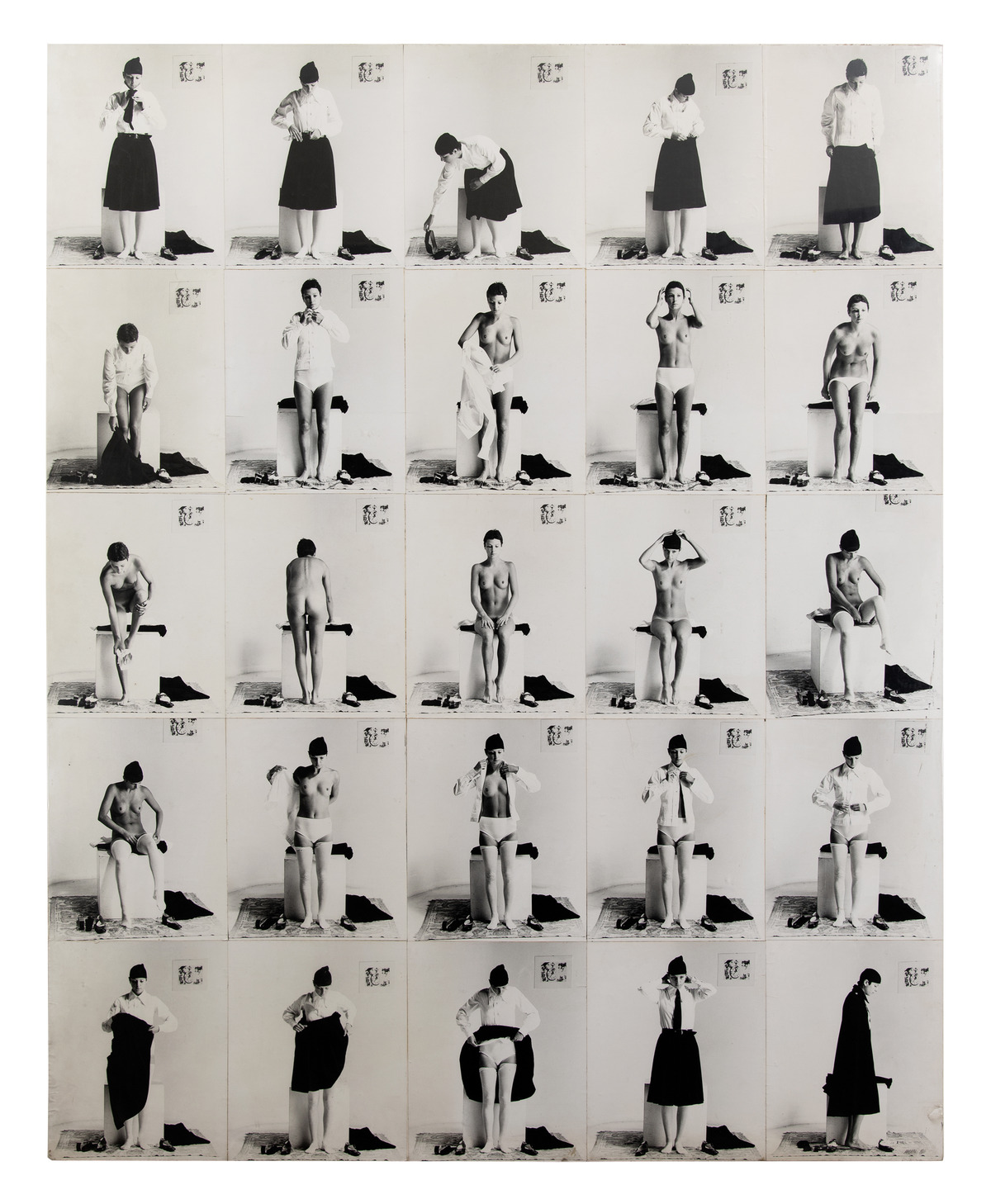 Collage fotografico con immagini della performance Ideologia e natura (inv. 3324), ripresa nello studio della fotografa Elisabetta Catalano, composto da una sequenza di venticinque scatti montati su cartoncino e impaginati su cinque righe e cinque colonne. Il collage, intelaiato, è protetto e schermato da un foglio di plastica trasparente che è parte integrante dell’opera.