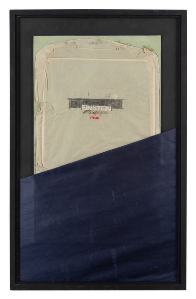 Quadro composto da uno schermo in carta di “prima generazione” staccato dal suo telaio originale (di cui conserva ancora la forma) e incollato su una base telata color verde acqua, a sua volta montata su un fondo di cartone nero. Una carta color indaco scuro avvolge la parte inferiore del pannello lasciando a vista il centro dello schermo su cui si leggono le parole «EINSTEIN» e «FINE» scritte con lettere trasferibili sopra una cancellatura a grafite.