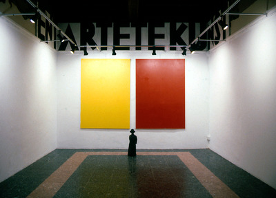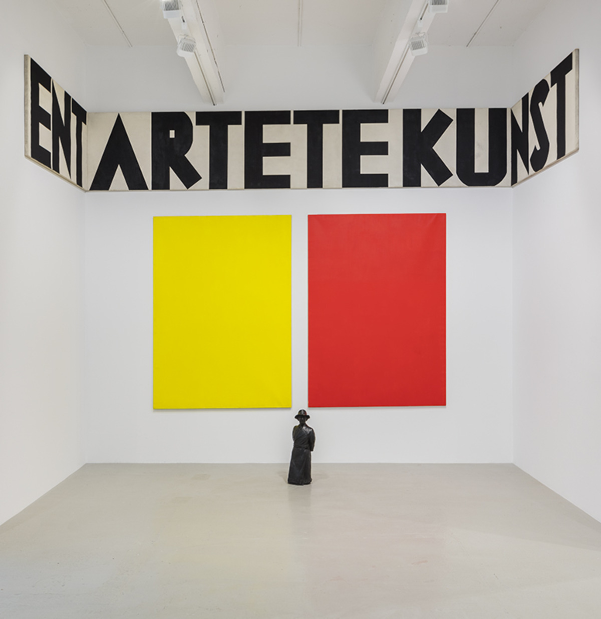 Due grandi tele monocrome, una rossa e una gialla, si stagliano al centro della parete. Sopra di esse, la scrittura-pittura “Entartete Kunst” (arte degenerata), olio su tela suddiviso in tre parti poste su pareti adiacenti, a suggerire un ambiente. Appoggiata al pavimento, al centro davanti ai monocromi, una scultura in bronzo riproduce Joseph Goebbels ripreso come nella famosa fotografia che lo ritrae all’inaugurazione della mostra di arte degenerata a Berlino nel 1938. Come nota Laura Cherubini, «la figura è tagliata nello stesso punto in cui finisce l’inquadratura della foto proprio perché non rappresenta l’individuo Goebbels ma il suo ruolo, la sua immagine pubblica»1.