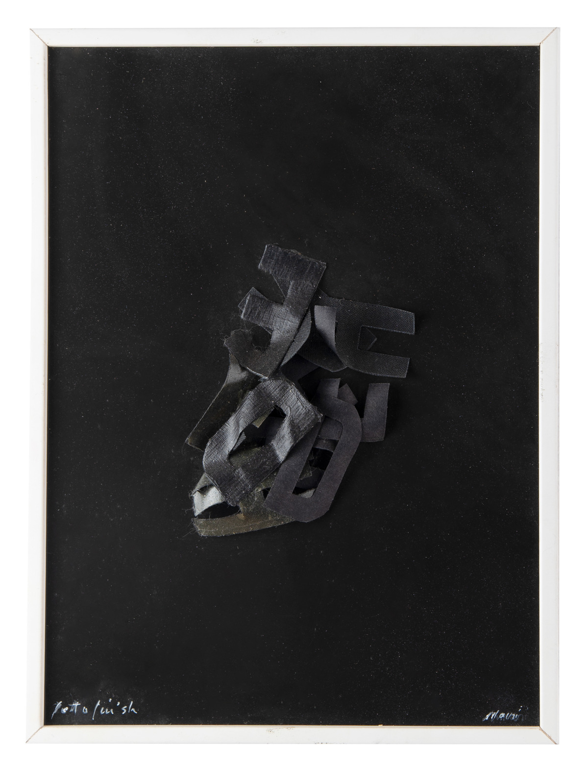 Al centro di una fotografia alla gelatina al bromuro d’argento, completamente nera, stampata su carta baritata lucida, sono incollate alcune lettere in plastica che si presentano deformate e incollate una sopra l’altra. L’opera è parte dell’insieme Foto finish (cfr. inv. 800), realizzato nel 1976 ed esposto nel 2000 nell’installazione Tirannicidi alla Calcografia di Roma.