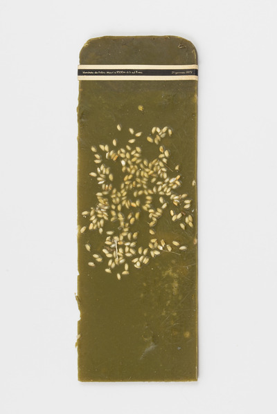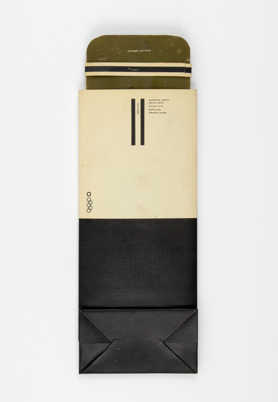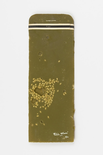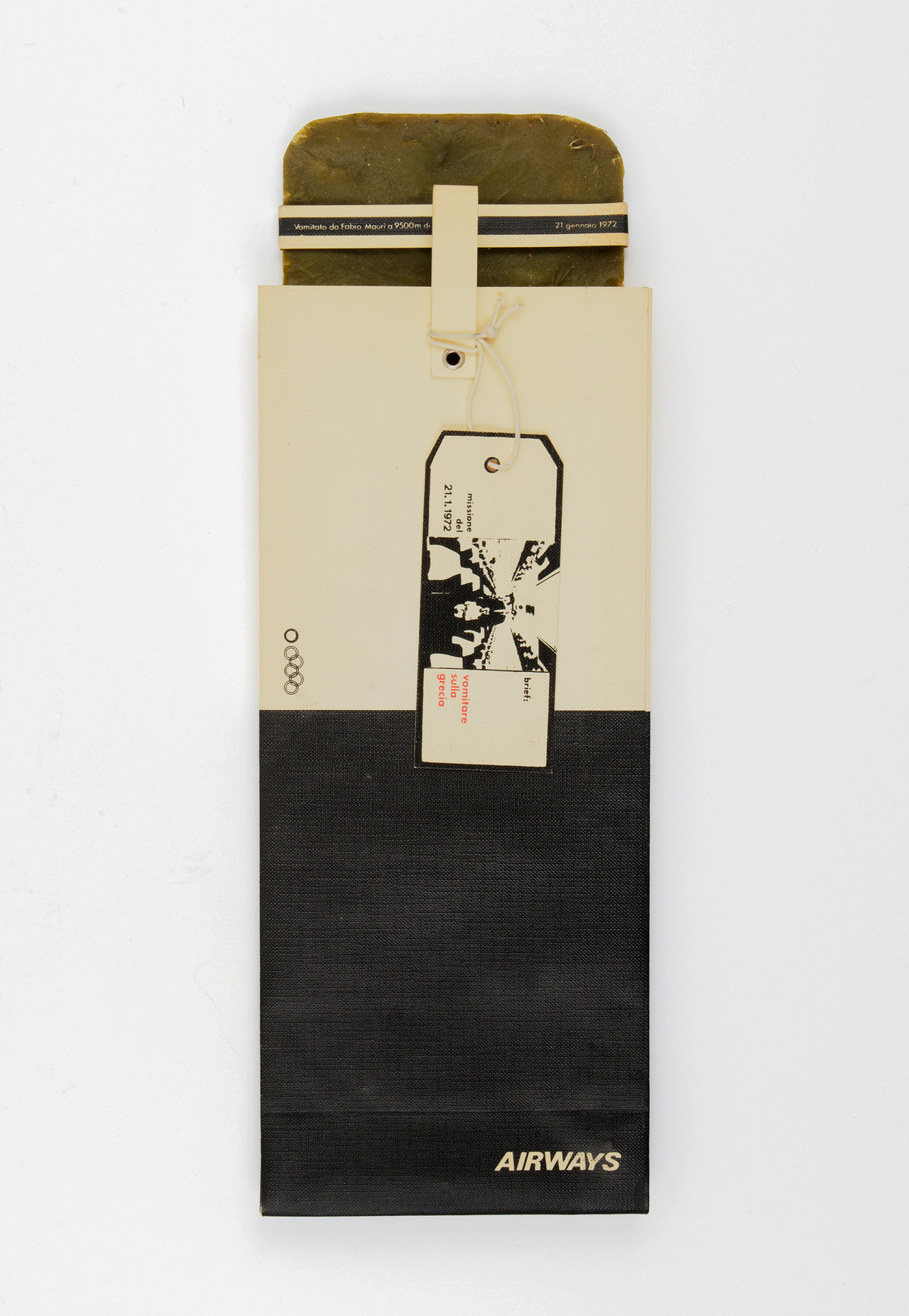Il multiplo consiste in una busta in carta telata con logo e grafica di una fittizia compagnia aerea, (“Airways”) che simula il sacchetto per vomitare messo a disposizione dei passeggeri; all’interno della busta, alcuni chicchi di riso o stelline di pasta secca sono inglobati in una tavoletta di vetroresina di colore verde, blu o rossastro, leggermente diverso per ciascun esemplare. Sulla tavoletta, che fuoriesce di un paio di centimetri dalla busta, una fascetta di carta reca scritto: «Vomitato da Fabio Mauri a 9500 m di h sul Pireo. 21 gennaio 1972». Sul retro della fascia, il logo del Centro Multipli di Roma. Al verso di ciascuna tavoletta, in alto al centro, una scritta bianca a lettere trasferibili specifica «multiplo politico», accompagnata in basso a destra da firma e numero di esemplare. Ogni sacchetto è provvisto di un’etichetta con la scritta «vera foto di Fabio Mauri al ritorno dalla missione in Grecia» (cfr. inv. 1071), «emissione del 21.1.1972 / brief: vomitare sulla grecia».